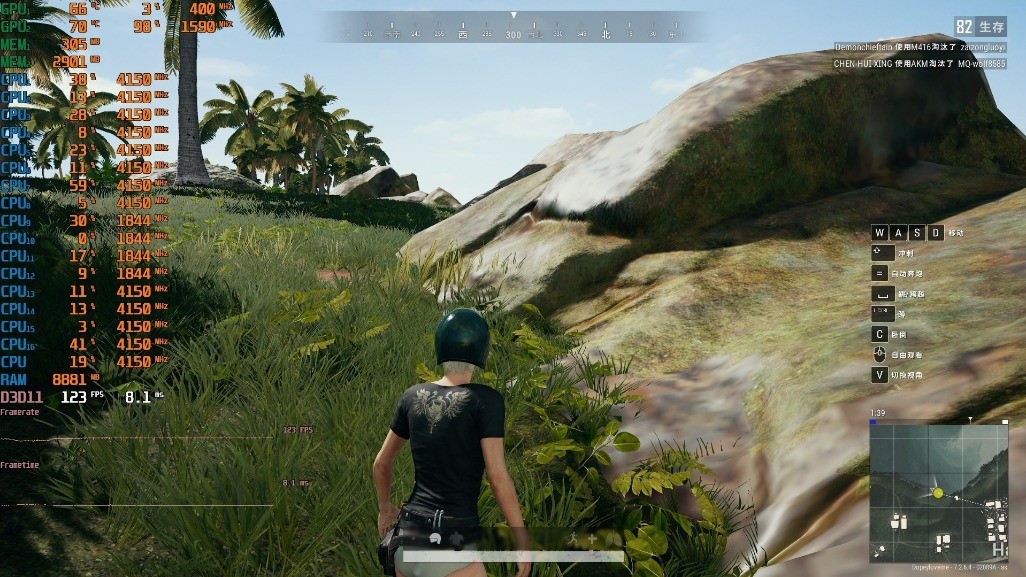 ▼吃鸡,1080P分辨率,高画质,室外游戏帧数在120帧的样子,显卡的核心温度在70℃,4800H的主频在4.15G左右上下波动