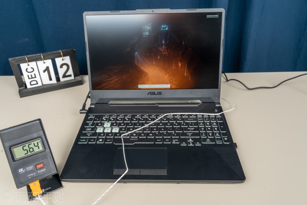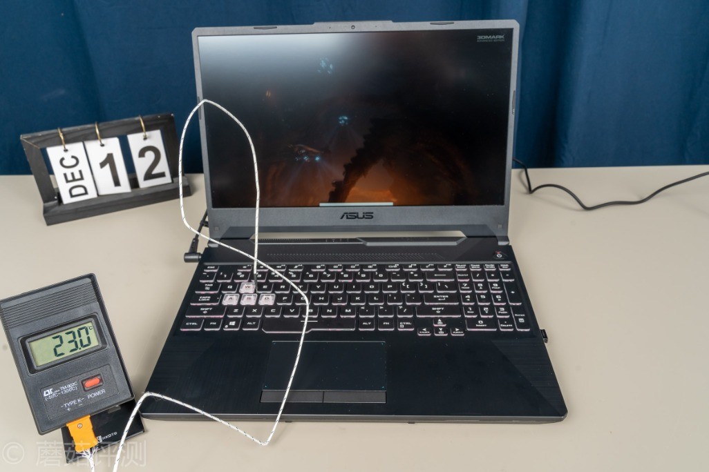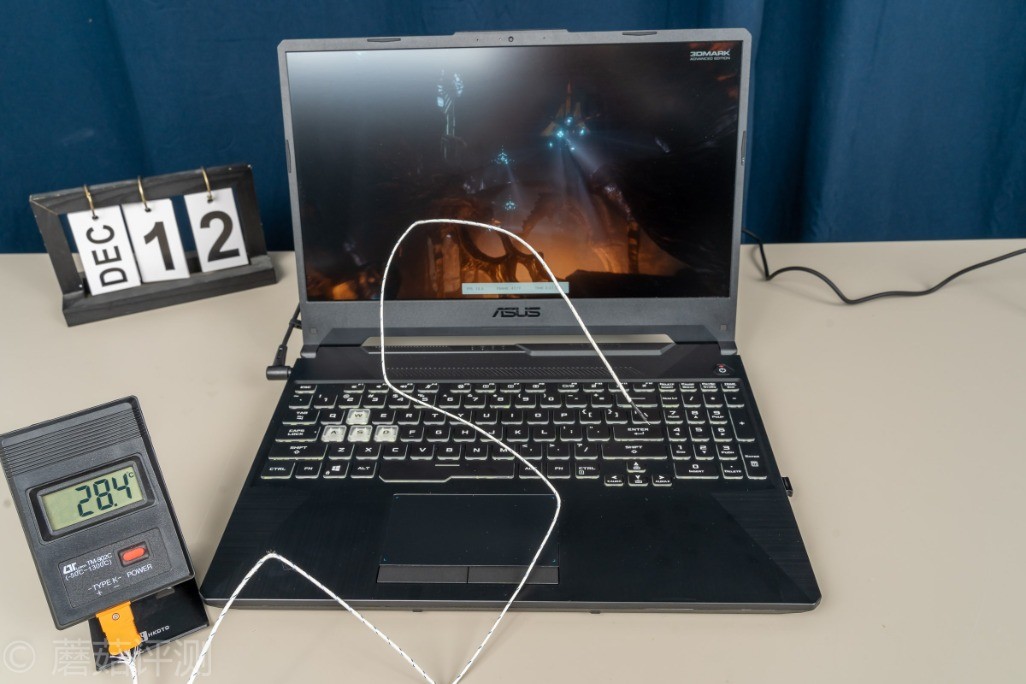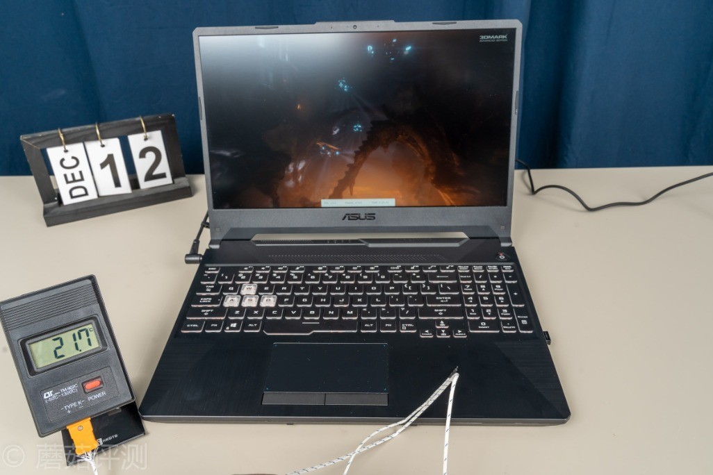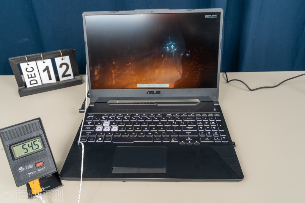 ▼掌托、触摸板基本上都没有什么温度,凉凉的。可以看到,华硕天选这款笔记本对于笔记本表面的温度控制,还是非常出色的,日常玩游戏的方向键位置,需要放手掌的掌托位置,都是凉凉的
