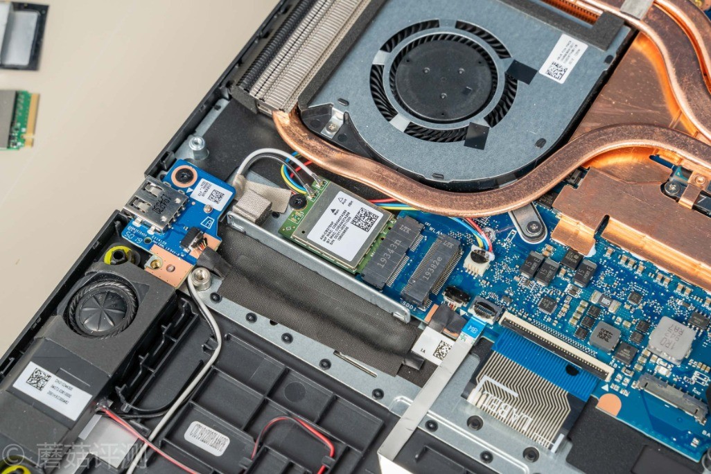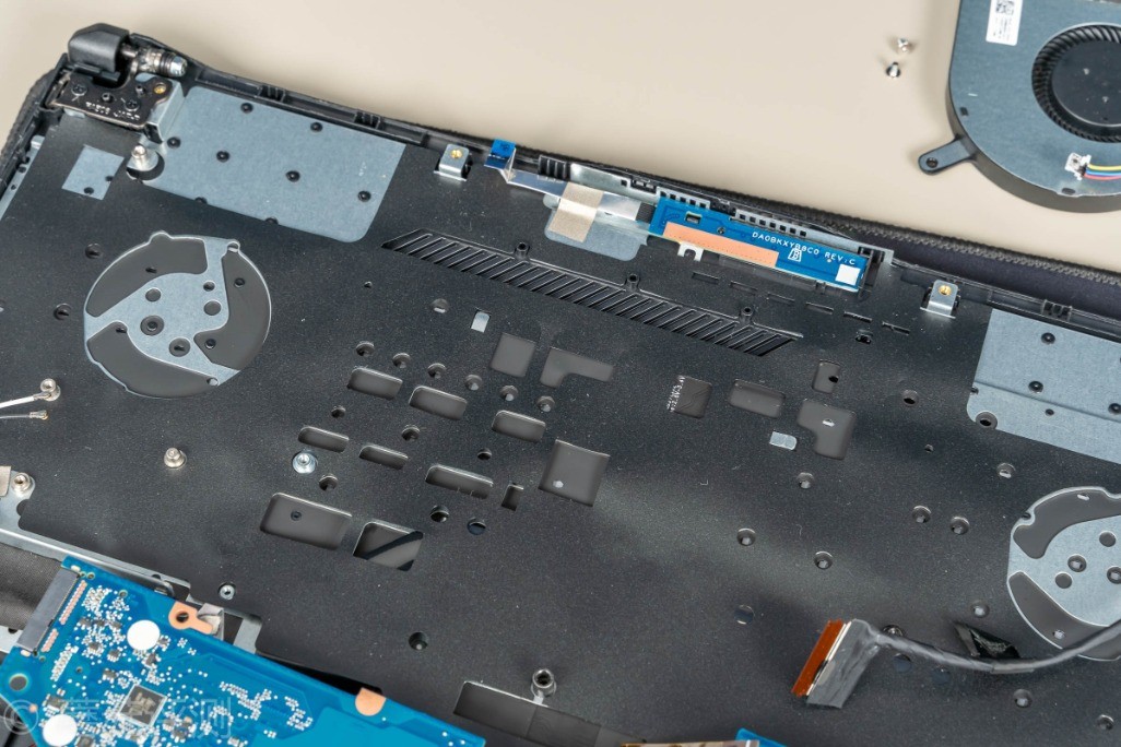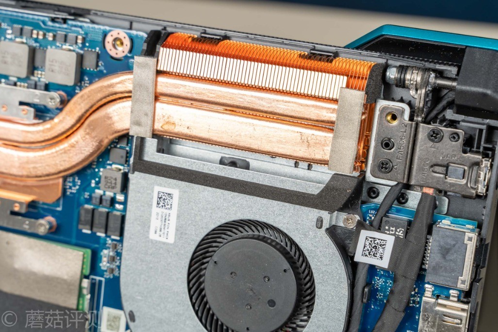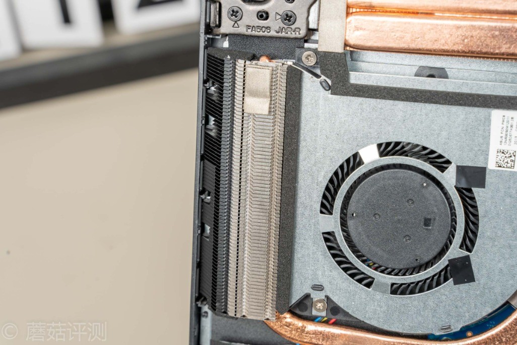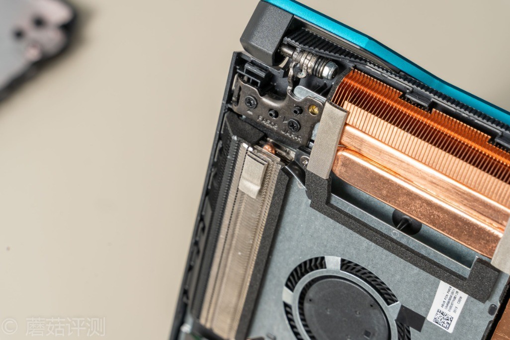 ▼散热风扇靠近散热鳍片的部分有留空,并未密封,应该是有笔记本内部的风道设计,配合上D面的特殊位置的开口,除了给处理器、显卡散热之外,也会有额外的风道照顾到笔记本内部的其他硬件。之前测试的时候,固态硬盘温度最高可以去到52℃,但是降温很快,停止测试没一会,固态硬盘的温度就回落到39℃,说明笔记本内部的风道不错