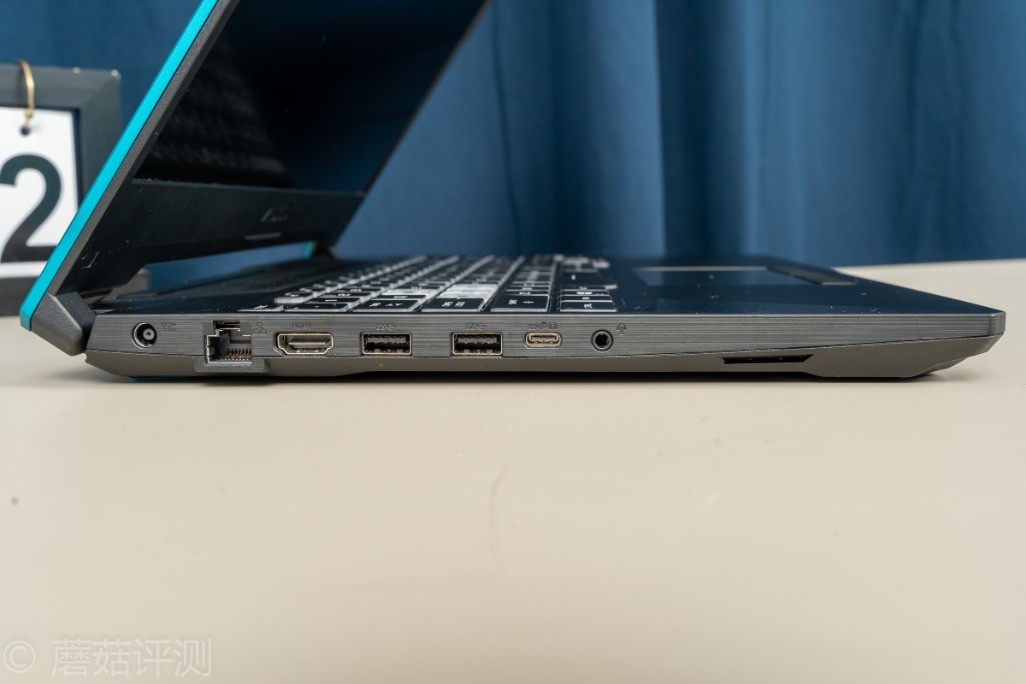 ▼这款笔记本的接口主要集中在左侧,从左到右依次是DC电源接口、RJ45、HDMI2.0b、USB 3.2 Gen1 Type-A x 2、USB 3.2 Gen2 Type-C支持DP1.4、音频接口