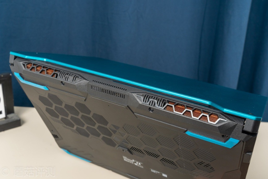 ▼笔记本的尾部左右各有一个出风口,金灿灿的铜质散热鳍片,看起来很闪亮