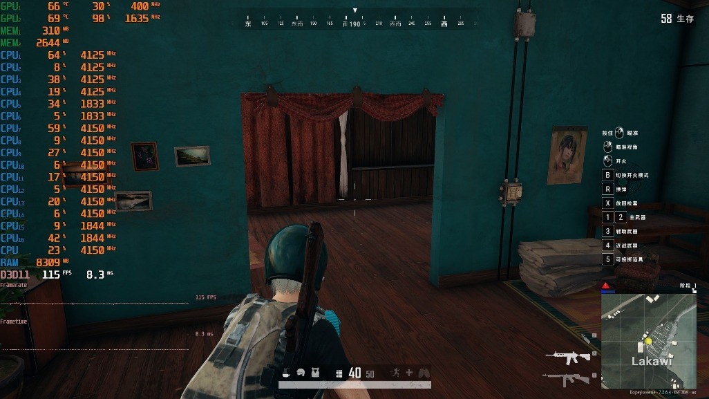 ▼室内游戏帧数在115帧左右,吃鸡时的整体温度表现良好,就是风扇有点吵