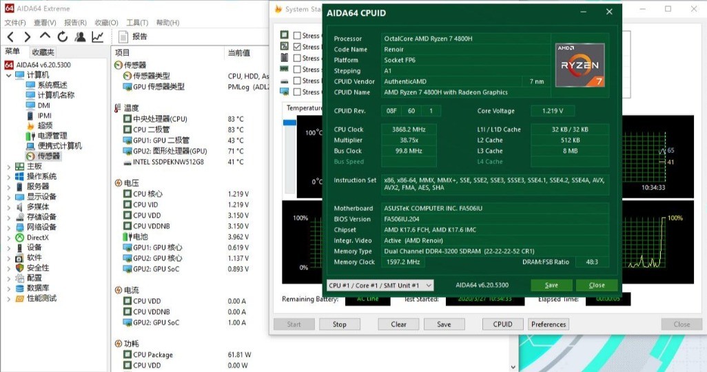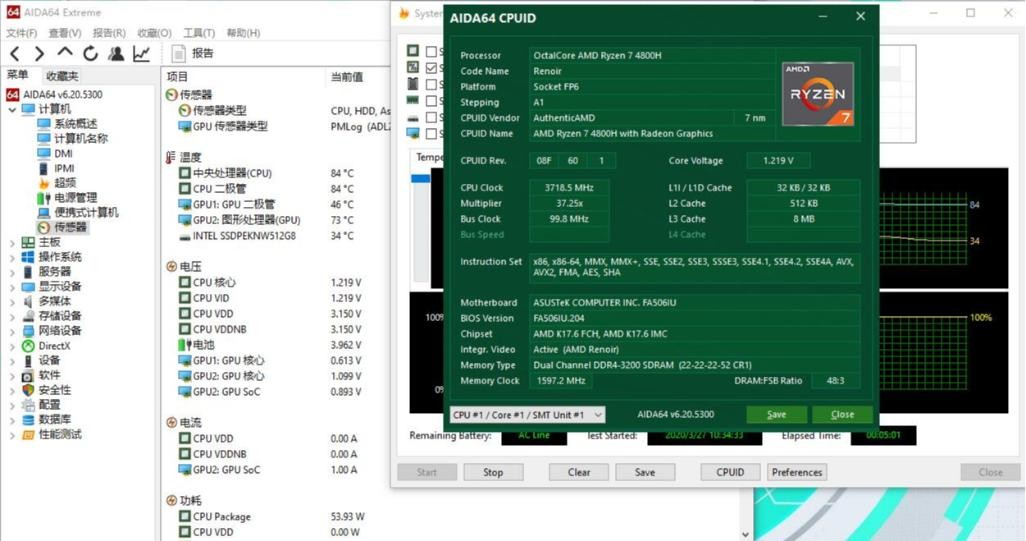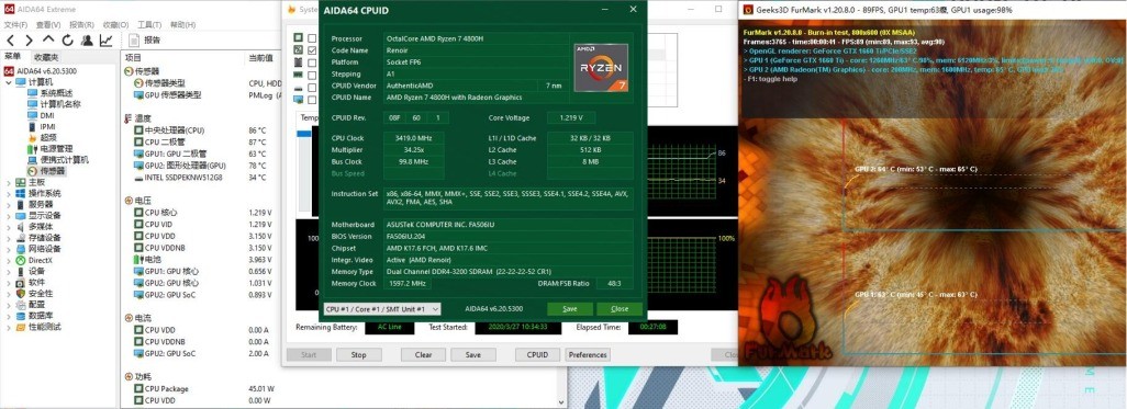 性能方面,4800H这颗8核心16线程的小怪兽还是非常强大的,受限于机型和Bios的原因,我这里就不过多测试处理器的性能。但是,峰值功耗可以去到61W,单烤FPU长达20分钟,处理器功耗依然能保持在45W,主频3.55G,干倒那啥啥,自然不在话下。