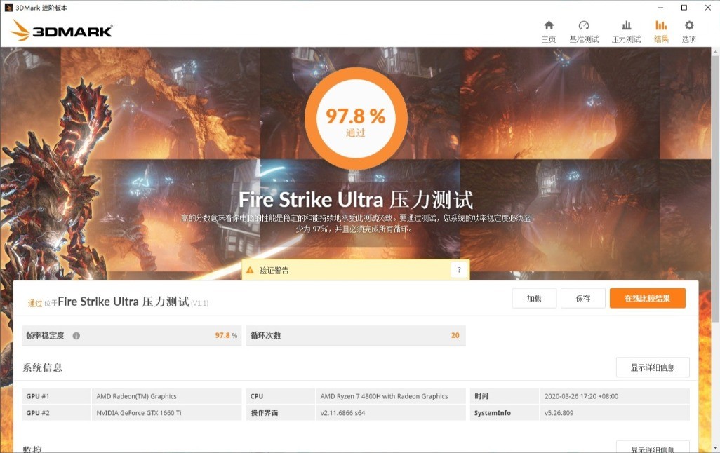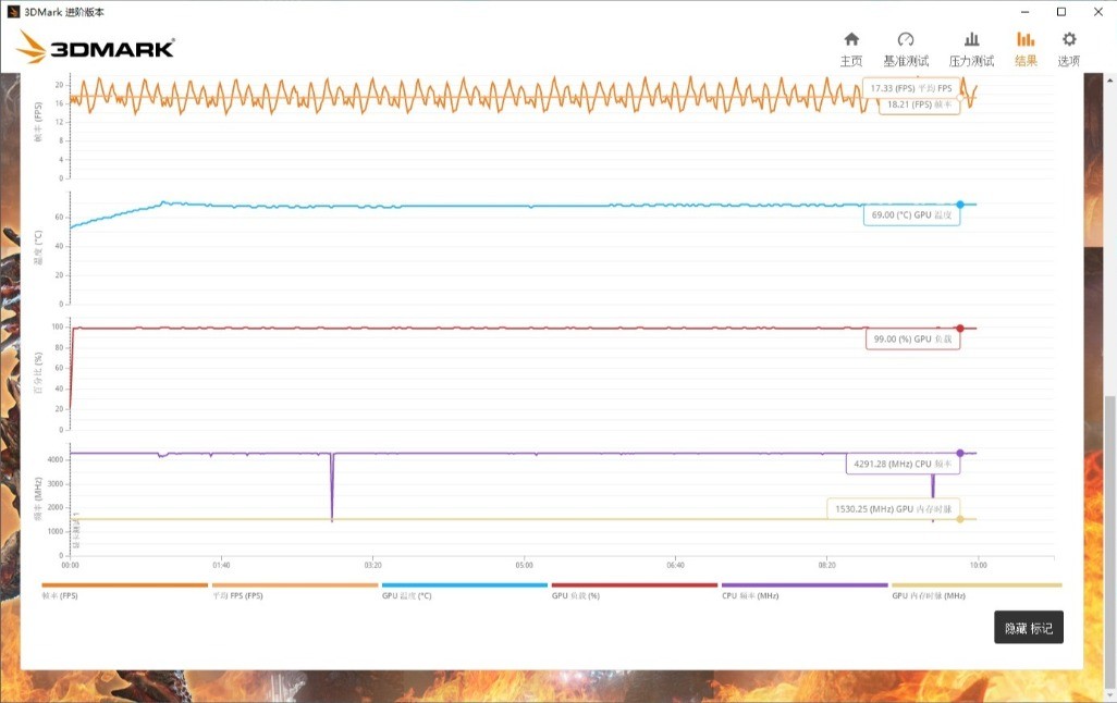 ▼最后是3Dmark的压力测试,FSU模式,帧数稳定率在97.8%左右