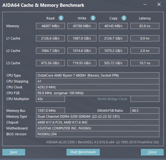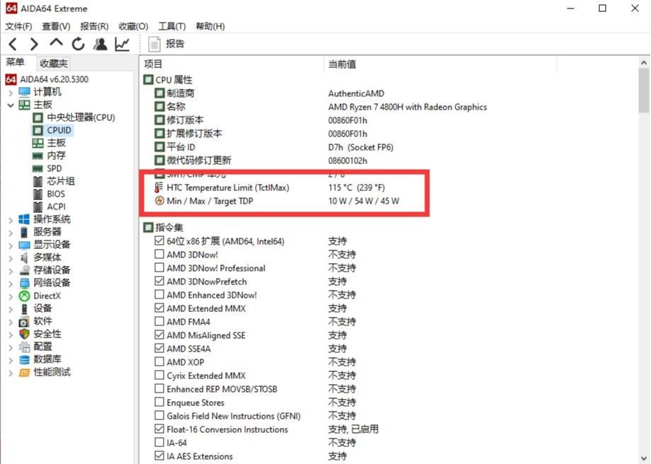 ▼仔细看Aida64中的处理器信息,华硕天选的这颗4800H的策略是MAX54W,稳定45W,貌似没有时间限制噢,手动眼斜,AMD Yes!