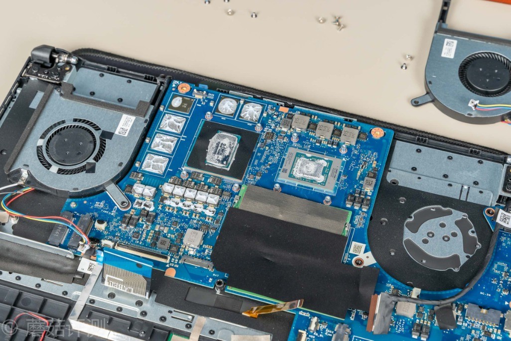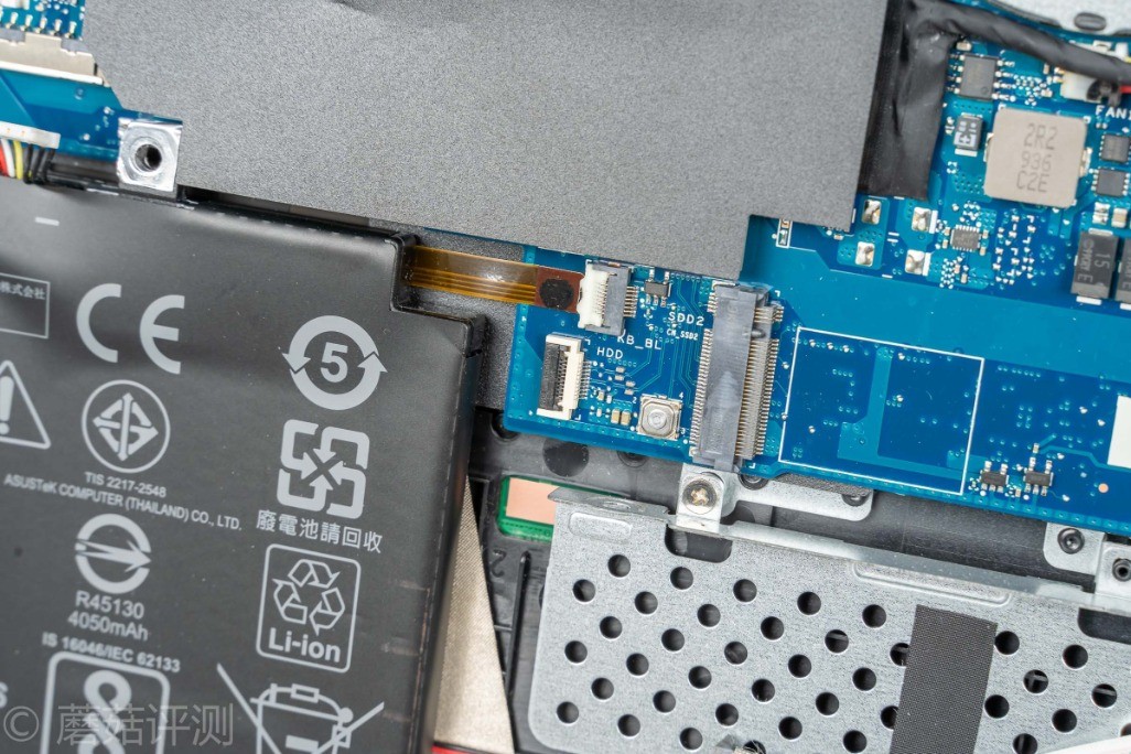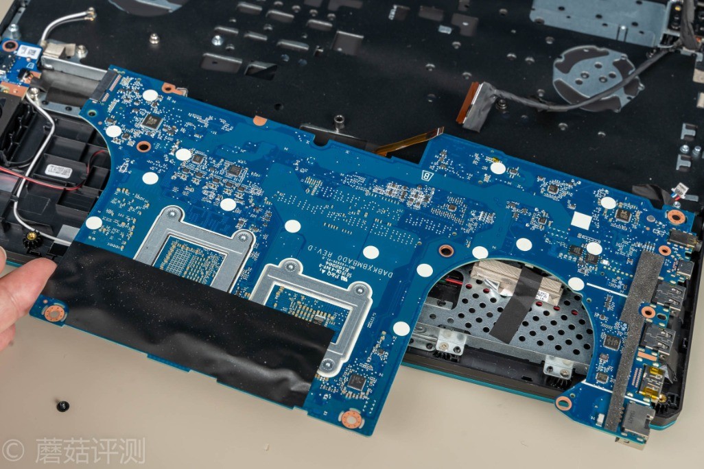 ▼拆掉D面之后,就可以看到华硕天选的主板了。主板是向下的,处理器和显卡的核心直接朝着D面,好评,可以让这两个发热大户的热量朝着D面传递,不会影响笔记本C面的温度。另外,散热模具直接就可以看到,日常清灰、维护会简单许多