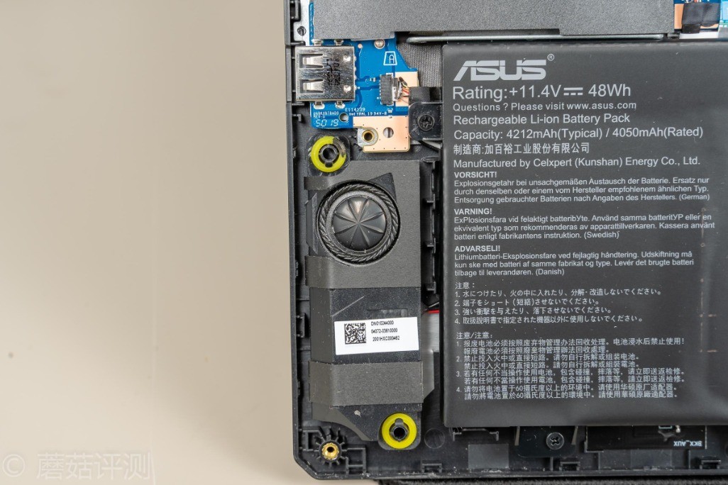 ▼左下角部分同样有一个扬声器,共鸣腔同样很大,右侧是笔记本的电池,额定48Wh