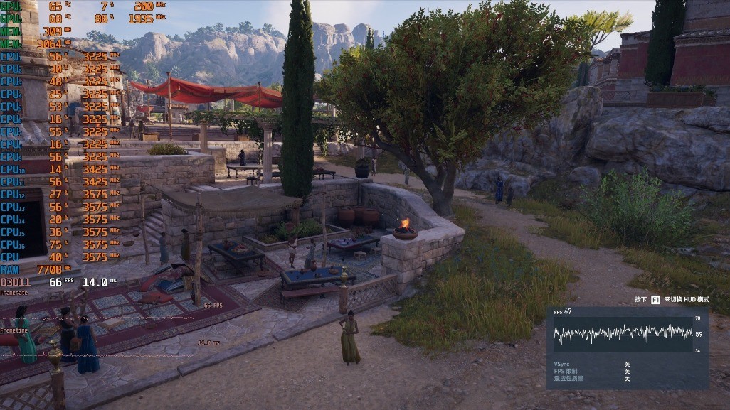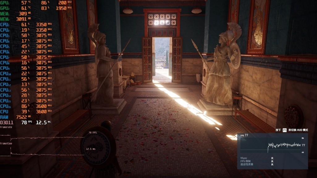 ▼接着是众生平等奥德赛,1080P分辨率,很高画质,体积云开到最低,走廊游戏帧数在78帧左右