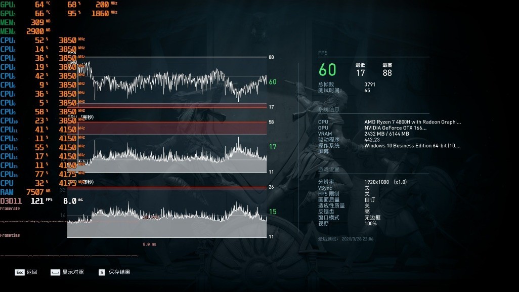 ▼整体的游戏帧数在60帧,华硕天选的这个4800H+1660Ti的配置组合,1080P分辨率、高画质下流畅玩奥德赛还是没啥问题的