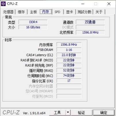 ▼内存这里是16G的双通道,频率是3200Mhz,时序22-22-22-52