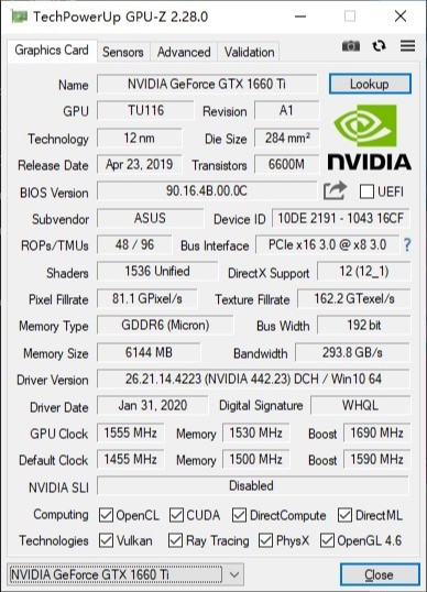 ▼独显是英伟达的GTX1660Ti,移动版和桌面版的硬件规格相同,仅在功耗上略有不同