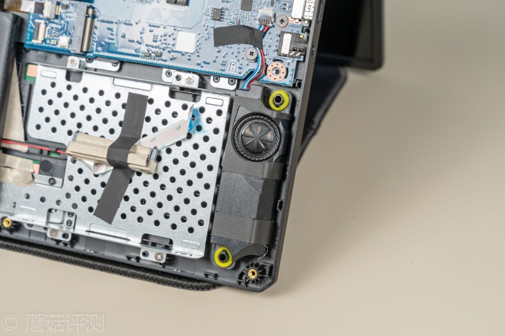 ▼笔记本右下角是扬声器,共鸣腔不小,音质不错,固定支柱有橡胶减震环