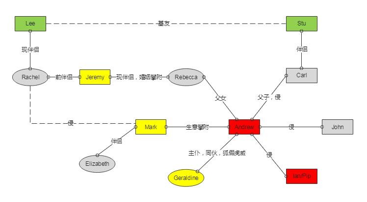 最后一个对比,是站在上面讲到的爱恨情仇之外和之内来看整个闹剧。闹剧之内的主要人物关系,上面基本已经讲到。闹剧之外,有两个人,并没有放太多感情到这个游戏中去,他们更像是旁观者,这两人是Carl的同性伴侣Stu和Rachel的现任男友Lee。