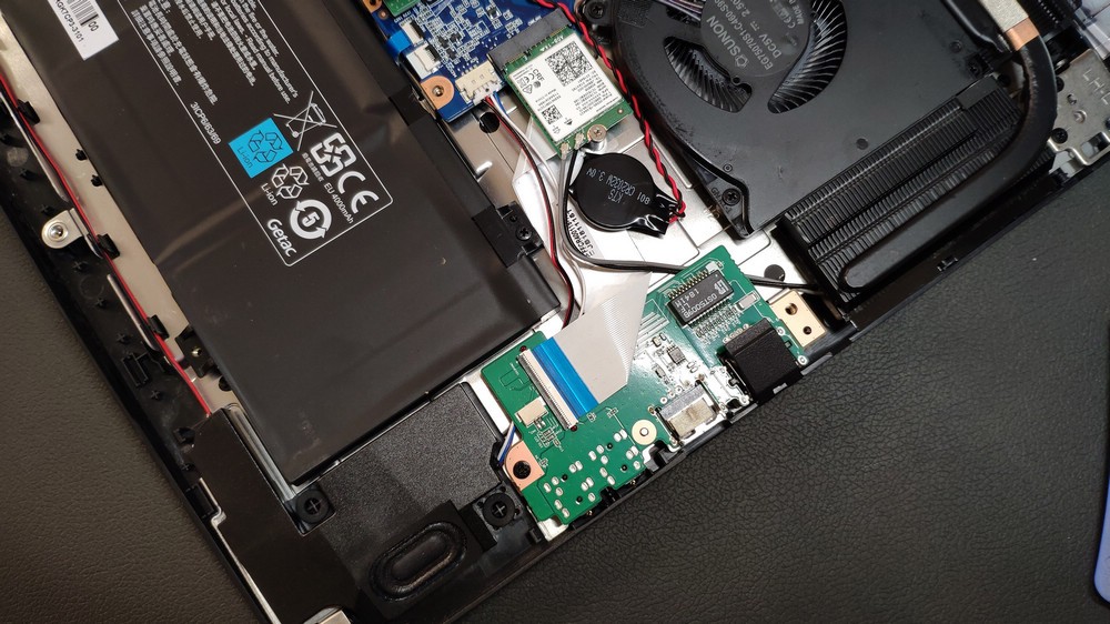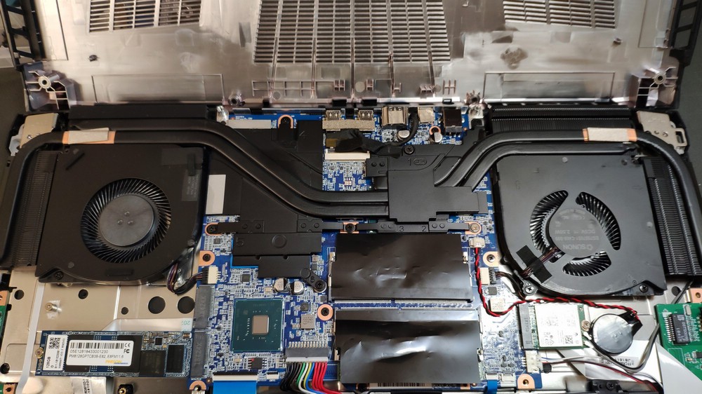 外观我们大致了解了下,下面我们再来看看本本内部的布局与用料及做工如何!从拆开第一眼来看,X3的内部布局还是很工整的,前半部被两大黑黑的高密扇叶涡轮风扇散热系统覆盖的区域就是CPU及GPU区,本本内发热最大的地方。左中下部分为存储区,右下角为电池供电及网络模块区!
