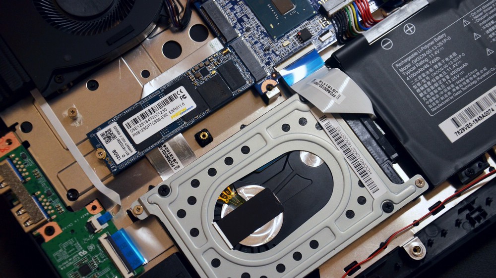 在X3的左下部为存储区,我们可以看到本本内部装有一块2.5硬盘和一根 PCIE SSD。本人拿到的这个就是官网首发配置:1T+128G PCIE SSD,据说线下还有硬盘是256G PCIE SSD的同价版本。从职业及实用性来讲,我也认为1T+128G PCIE SSD更为均衡些,符合我们学生即要游戏又要做图的工作要求!当然如果觉得这样的硬盘配置还不够用,我们可以从拆机图中看到X3还预留了一个 PCIE 插口。