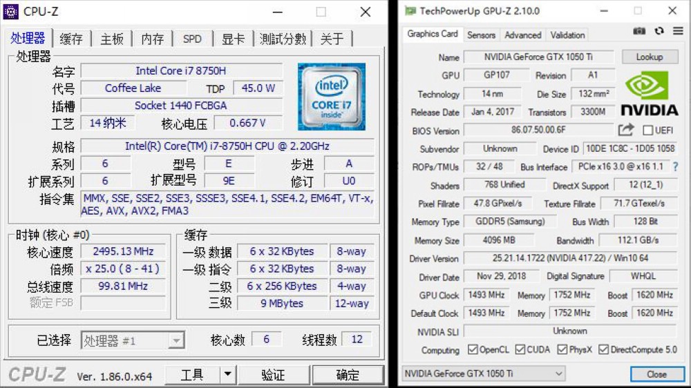 之所以有一小半空间被两个风扇给占着,就是因为下面这两货。通过检测我们可以看到X3的CPU采用的是第八代智能英特尔®酷睿™i7-8750H处理器。睿频4.1GHz,6核12线程(这个我是超爱呀!为什么下几张图有说)三级缓存9M,不论是从堆料上来讲还是各种测试跑分,这颗U整体性能比上一代又提升了近30%!这对于轻松驾驭大型游戏与多任务处理需求,指令响应的效率都会有所提升。而GPU方面X3采用的是NVIDIA GTX 1050Ti4G GDDR5电竞独立显卡,说实话这块独显在2019年来讲,其并非豪华顶配,但从性能来讲,现在这块显卡不论是在游戏电竞上还是专业图形需求上,它依然是畅玩3A大作及图形运算的性价比最高的利器。作为一款不到7K的游戏本X3,i7-8750H+1050Ti绝对依然是未来3年内最为均衡的主流配置。