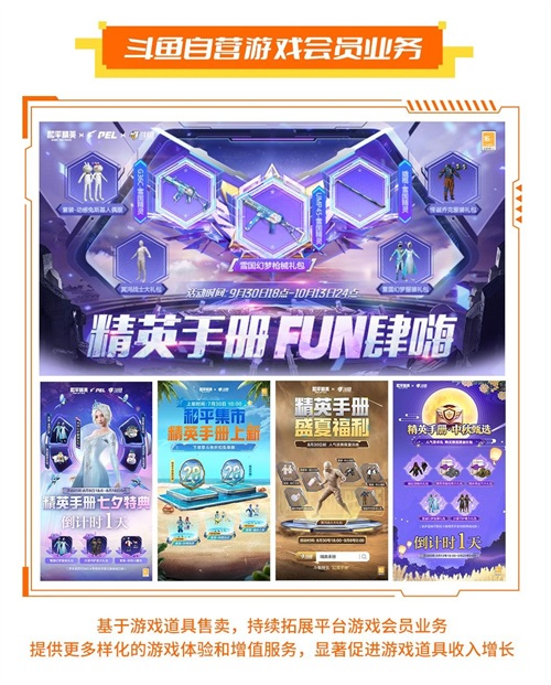 这背后是斗鱼在商业效率上的积极探索,除了在直播业务精细化运营外,斗鱼也在围绕版权赛事、自制内容、平台资源等平台优势,探索新的盈利点。例如在和平精英PEL官方赛事中推广游戏会员业务、在穿越火线斗鱼解说杯及合作赛事枪王杯等资质赛事中推广游戏道具。