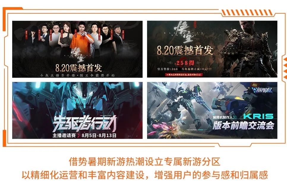 典型如《黑神话·悟空》的爆火,全民涌入的热潮下,相关直播、技术解读等内容需求短时间内爆发,斗鱼围绕该游戏,第一时间产出优质直播内容,游戏上线首日,斗鱼黑神话分区2小时开播主播数占全站的23%。