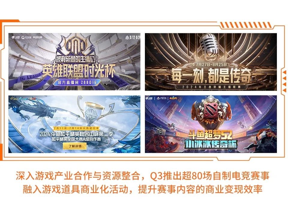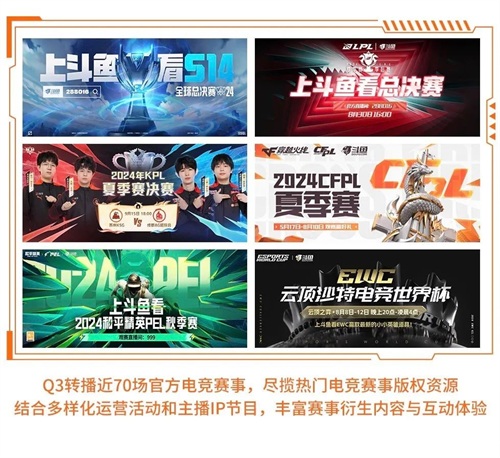 斗鱼在此期间,转播了近70场官方大型赛事活动,包括2024英雄联盟全球总决赛(S14)、英雄联盟LPL季后赛、王者荣耀KPL夏季赛等,还独家播出了CSGO的XSE亚洲职业邀请赛(XSE Pro League)等。并围绕版权赛事推出多种模式的衍生内容,例如主播Vlog+直播、主播户外节目+赛事解说。