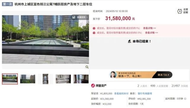 今年5月中旬,该房产因涉案原本应该进入司法拍卖流程,但被执行人也就是原房主通过与法院协商,将房子自行商业拍卖。评估价4208.13万元,起拍价3156万元,相当于7折起拍。
