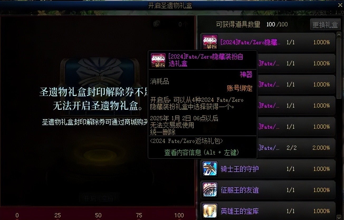 所以总计,100个封印解除券可以拿到2套隐藏时装(1账绑+1可交易)。