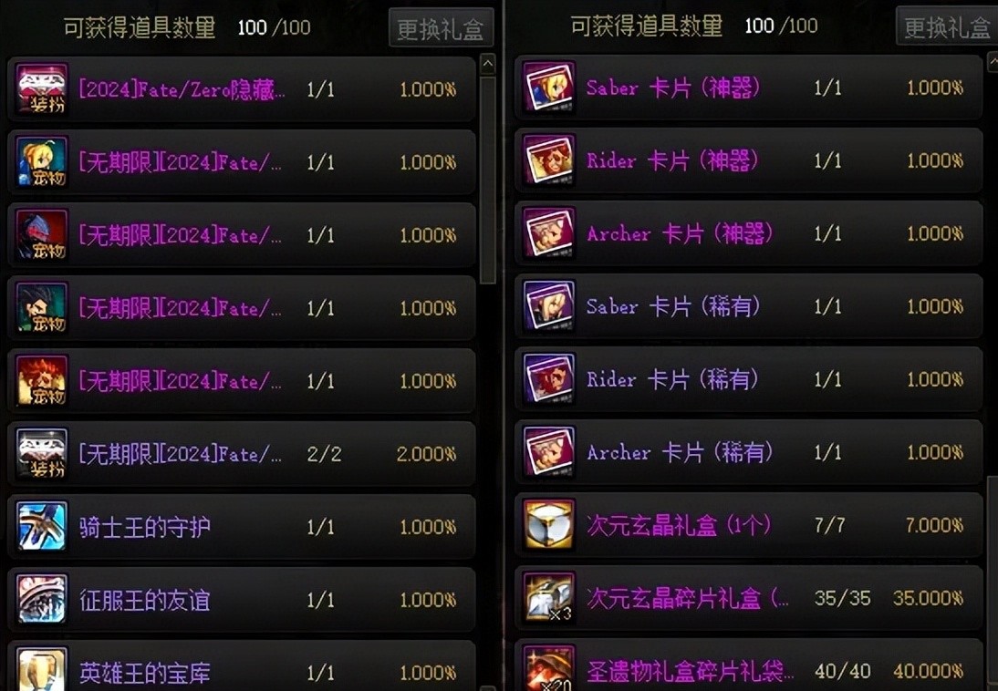 1套隐藏时装、2套可交易普通时装、5个可交易称号、4个可交易宠物、6张附魔卡、1800礼盒碎片、7个次元玄晶、105个次元玄晶碎片。