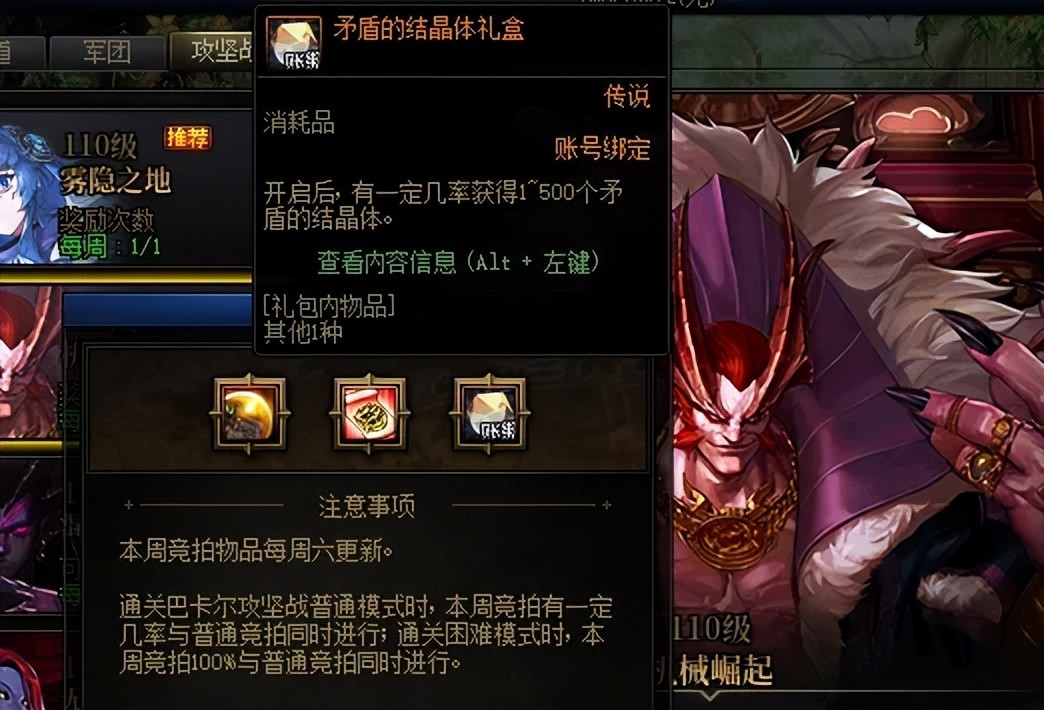 【5】然后就是11.30团本周竞拍奖励刷新,巴卡尔又新增了矛盾盒子!