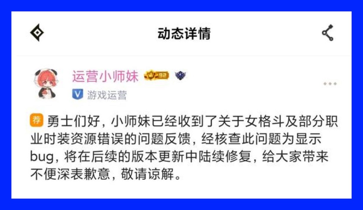 (1)女格斗时装BUG问题。先遣服的BUG直接端上正式服,体验服是摆设吗?