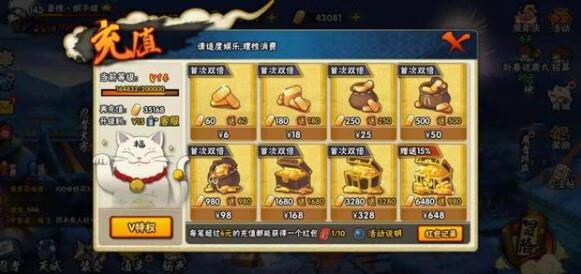 如果是只想出忍者,再充值方面精打细算的玩家,可以充值448元,加上赠送的金运铃刚好可以购买蝎。至于这448元的充值方法,可以选择328+98+18+6,购买450个铃铛,加上赠送的,一共600个铃铛,刚好够用。阿飞还没出的玩家可以选择328+168,多48个金运铃换一片阿飞。