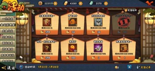 最后一种是土豪玩法,年初首充双倍已经全部充值,如果是都充一遍拿双倍奖励的话,就可以获得两个忍者,比如蝎和鬼鲛,然后剩下的铃铛还是优先兑换S宝箱。不建议牺牲A忍去拿究忍具,虽然短期来看,忍具可以加非常多的战力,但是最后大家都会出忍具的,A忍则是过了这个村没有这个店。