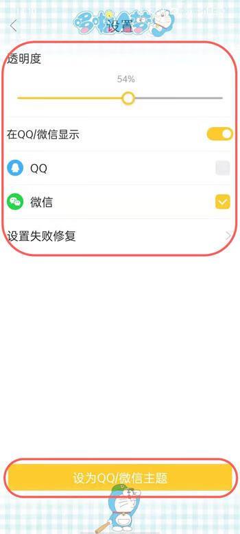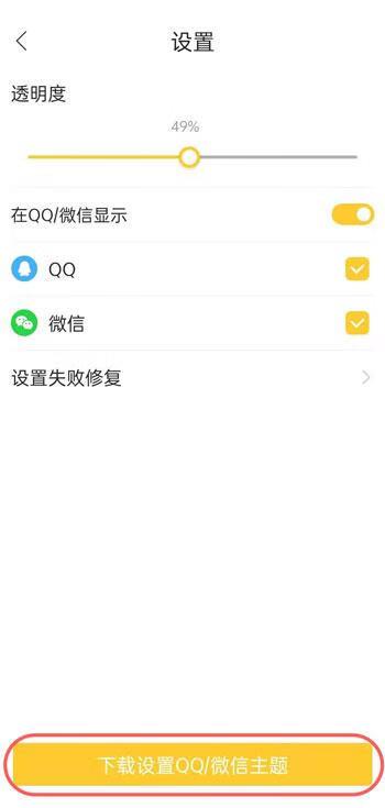 5.下载后,我们可以在该页面看到具体的效果,设置显示的透明度、应用途径,点击【设置QQ/微信主题】;